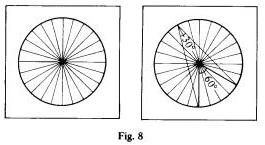 Na verdade, o uso da medida de arco feita pelos autores, leva a uma fictícia simplificação da linguagem, que ao final camufla os fatos matemáticos envolvidos. Pois os que os autores teriam a dizer, de modo claro, seria o seguinte: “A medida de um ângulo inscrito é igual à metade da medida do ângulo central correspondente”, que dispensaria totalmente o conceito de medida angular de arco. (É curiosos notar que o autor 2 enuncia desse modo, mas em seguida acha necessário reenunciar em termos da medida de arco). Costumamos explorar a propriedade num “Geoquadro circular”. Trata-se de uma placa de madeira, na qual desenhamos um círculo dividido em 24 ângulos de 15o. No centro, e em cada ponto divisório dos arcos são colocados pregos, enterrados apenas até a metade. (Fig. 8). Podemos marcar, com elásticos presos aos pregos, ângulos inscritos a 60o., 45o. , 30o, com auxílio dos esquadros. A medida do ângulo central correspondente poderá, nestes casos ser lida diretamente, contando-se o número de ângulos de 15o contidos no ângulo central. A situação mostrada no geoquadro torna-se bastante clara e elucidativa, como mostra a Fig. 8.