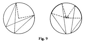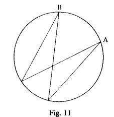 Fig. 12 Estes são os fatos fundamentais relacionados à propriedade citada, e que os alunos devem conhecer de modo claro e sedimentado. Permitem a resolução de um número grande de problemas interessantes. Há outros dois resultados, que também são conseqüências quase imediatas do Teorema do Ângulo Inscrito. Referem-se a ângulos internos ou externos aos círculos, que valem “a semi-soma ou a semi-diferença dos arcos”. Não são tão importantes que mereçam destaque especial, e introduzi-los nesta fase é dar ênfase a detalhes. Há livros que mencionam inclusive nomes para os ângulos em questão: “ângulo excêntrico interior” e “ângulo excêntrico exterior”, num evidente exagero de terminologia. Somos de opinião que uma maturidade dos aluno em aplicações do Teorema do Ângulo Inscrito os levará a resolverem de modo natural, fundamentado em argumentos geométricos, os problemas em que aparecem tais ângulos. Mentalizar mecanicamente esses resultados na 7.ª série é contraproducente à evolução do amadurecimento geométrico dos alunos. Não devemos sobrecarregar os alunos com fórmulas e resultados secundários, e solicitar deles mera aplicação imediata dos mesmos, num processo que envolve mais memória do que raciocínio.