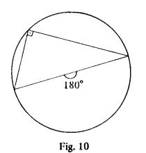 2) Um ângulo inscrito numa circunferência, cujos lados encontram a mesma nos pontos extremos de um diâmetro, é reto. (A figura mostra que, no caso, o ângulo central mede 180º.)