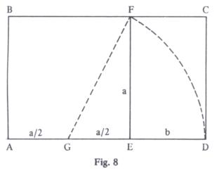 Vamos construir um retângulo áureo a partir de seu menor lado AE = a (Fig. 8). Para isso construímos EF = AE perpendicularmente a AE. Com centro em G, ponto médio do segmento