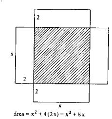 Tomemos um quadrado de lado x para representar o termo x2, e quatro retângulos de comprimento x e largura 2, para representarem o termo 8 x, conforme figura 2.