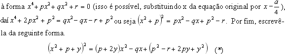 equação é uma cúbica, cuja resolução é conhecida. O passo seguinte é voltar à equação (*) substituindo y pelo seu valor encontrado acima; ela se reduz a equações de segundo grau, cuja resolução é bem conhecida.