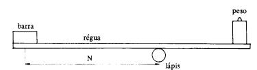 38. Queremos medir o peso de uma barra homogênea de seção retangular. Possuímos um peso de 100 g, uma régua graduada, lápis e papel. Como devemos efetuar a medida sem destruir a barra? |