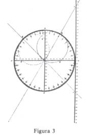 Considerando OQ de medida 1, temos que OQ” é cosseno do ângulo AÔQ, OQ” é o seno e AT é a tangente. Na Figura 3 apresentamos duas posições diferentes da transparência da Figura 2. Se no lugar do papel ofício (Fig. 1) usarmos algo transparente, então o conjunto pode ser posto num retroprojetor, resultando num agente altamente motivador da sua aula.